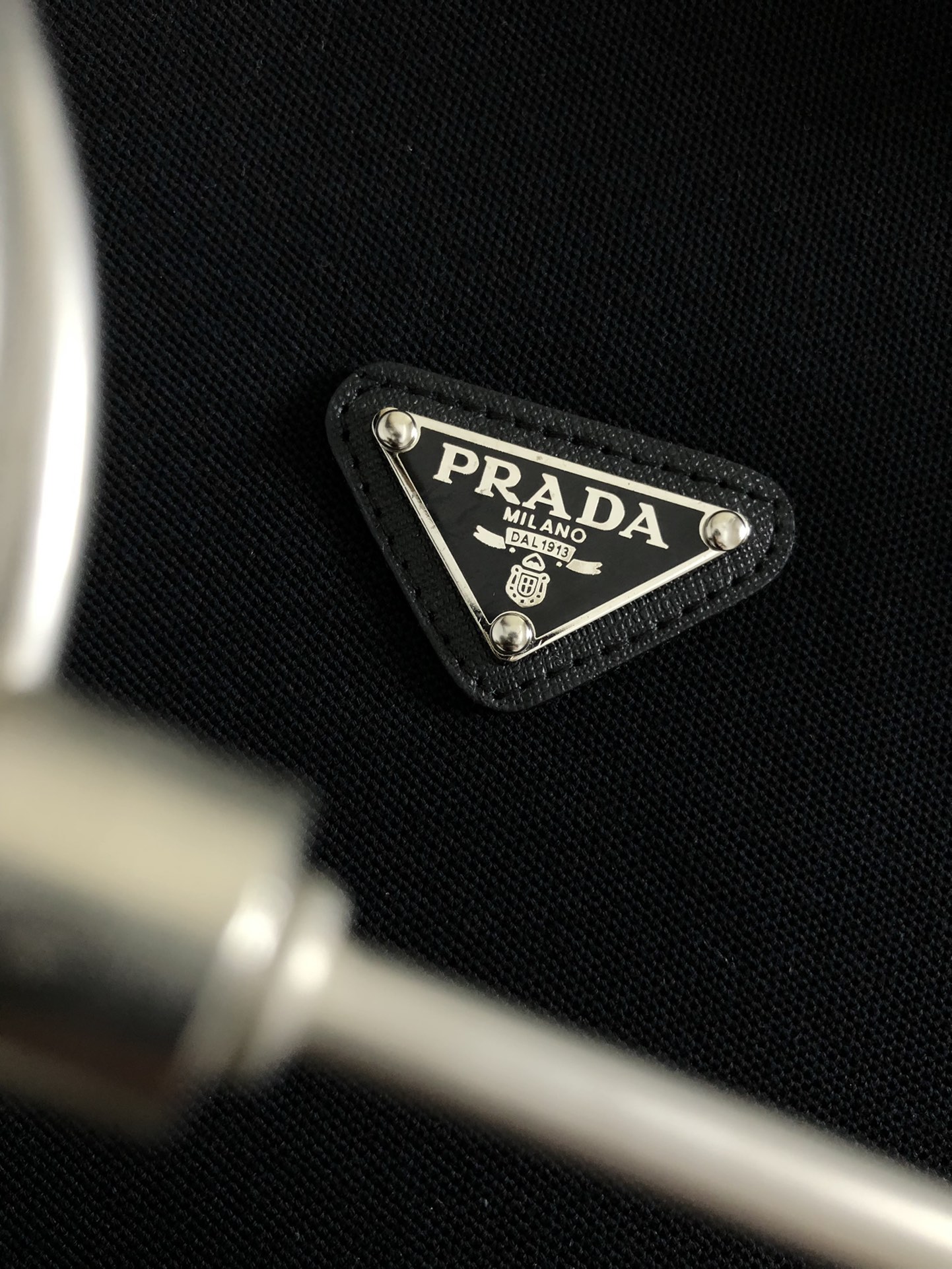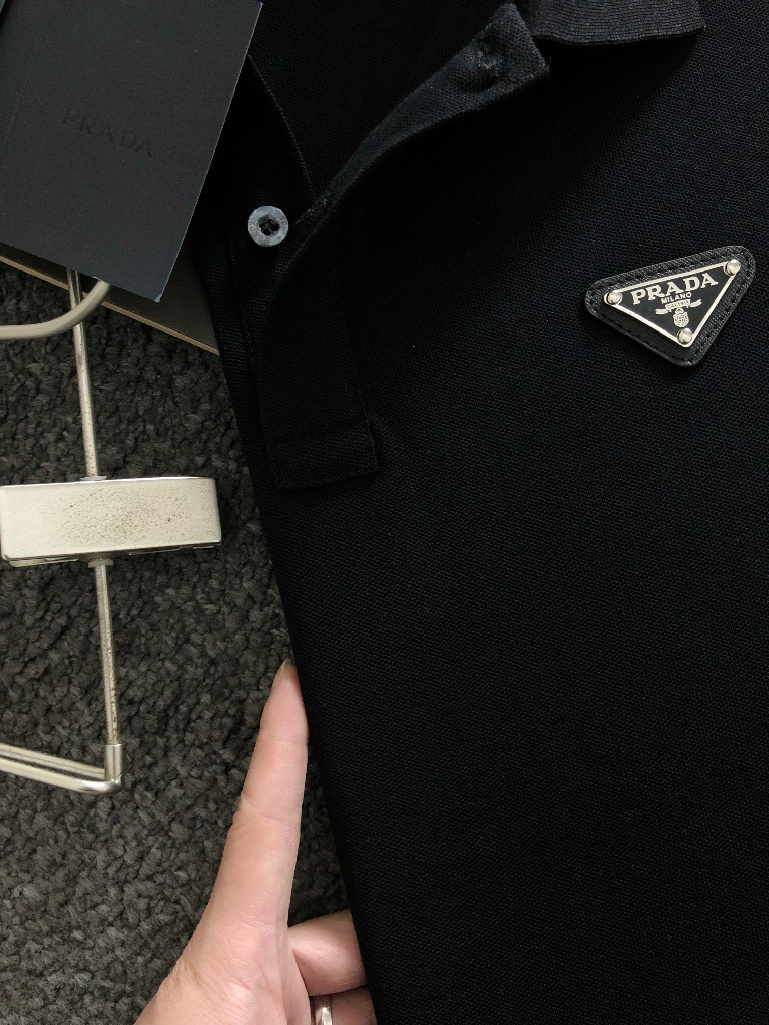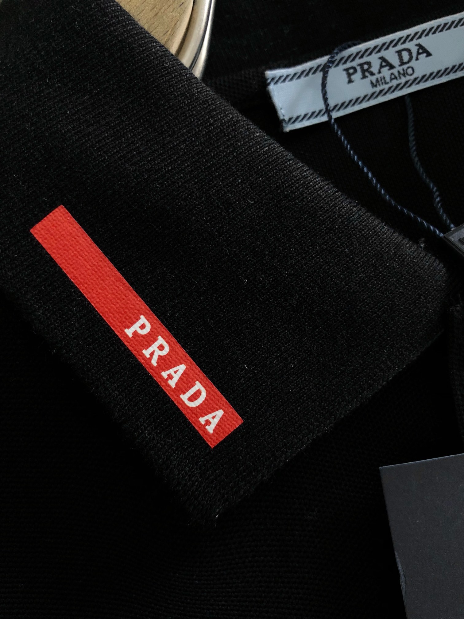 - PRAD7*合身版型 黑色立體金屬三角標領口紅條字母polo翻領短袖