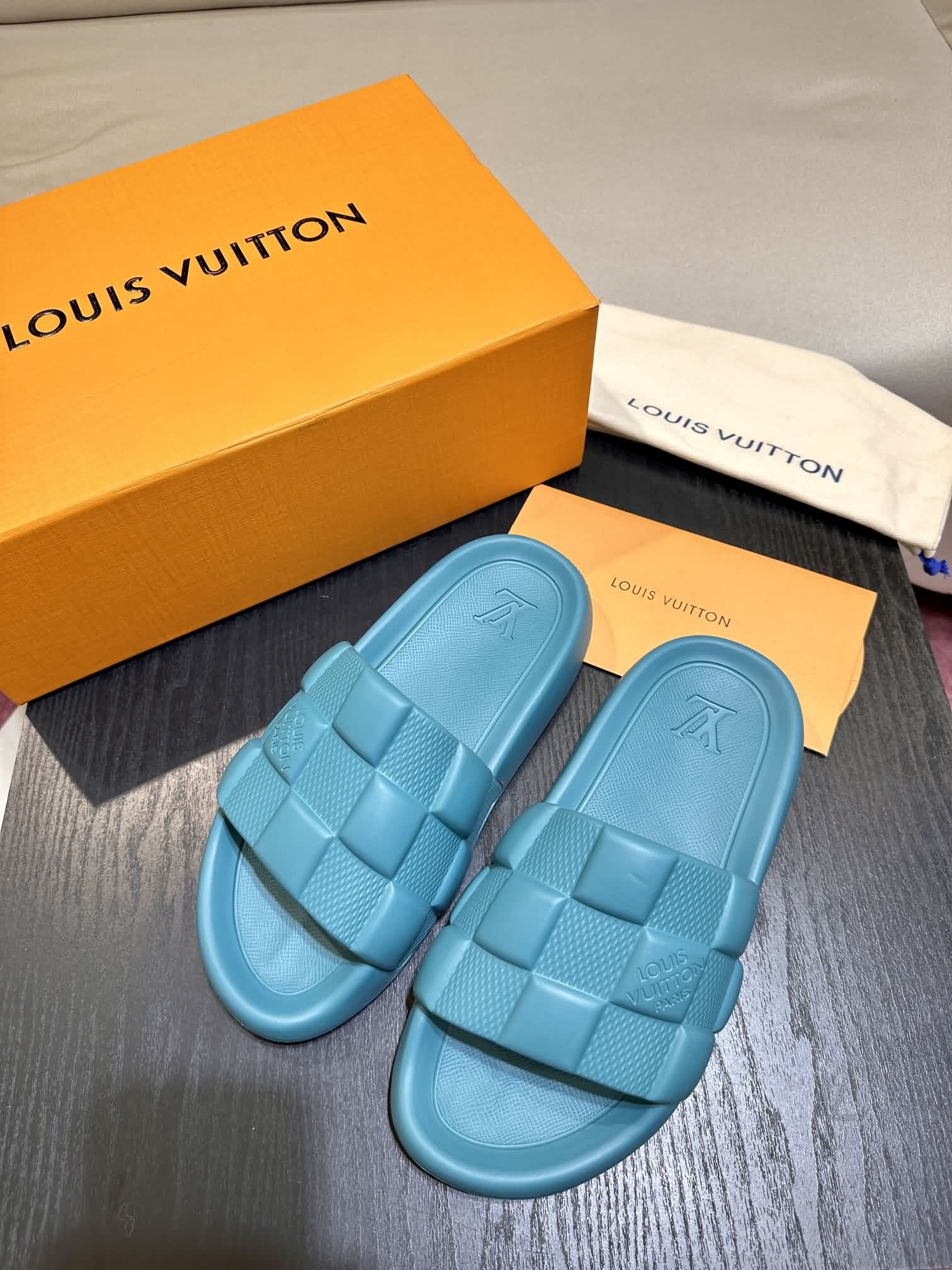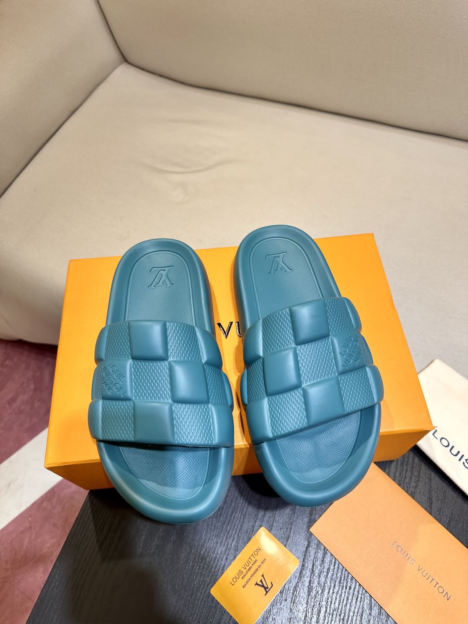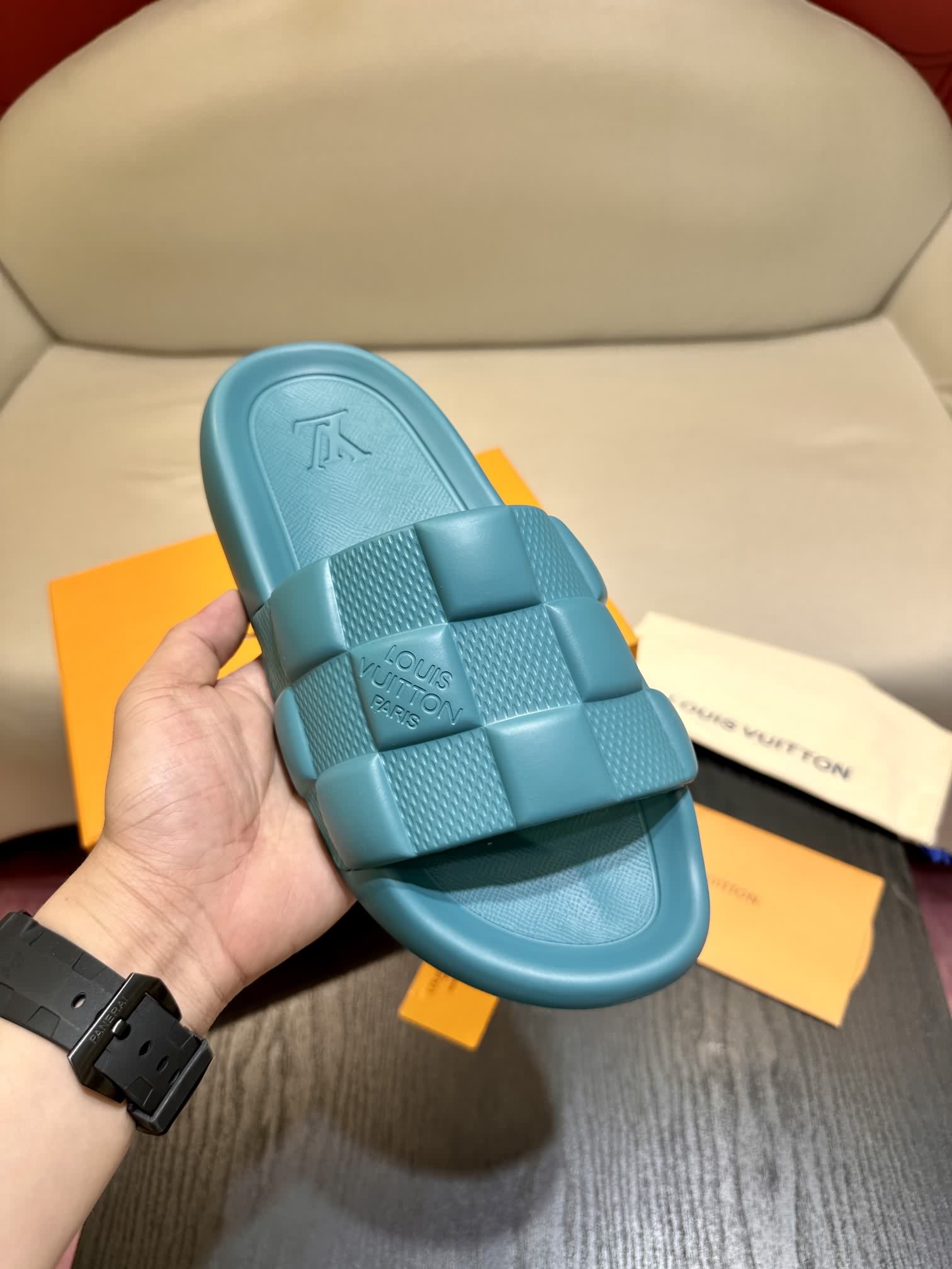 LV情侶款本款 Waterfront 涼拖取材 Maxi Damier 橡膠,創意放大路易威登的經典 Damier 圖案。防水性能適宜池畔穿著,韌性鞋墊和輕盈橡膠外底升級舒適體驗。