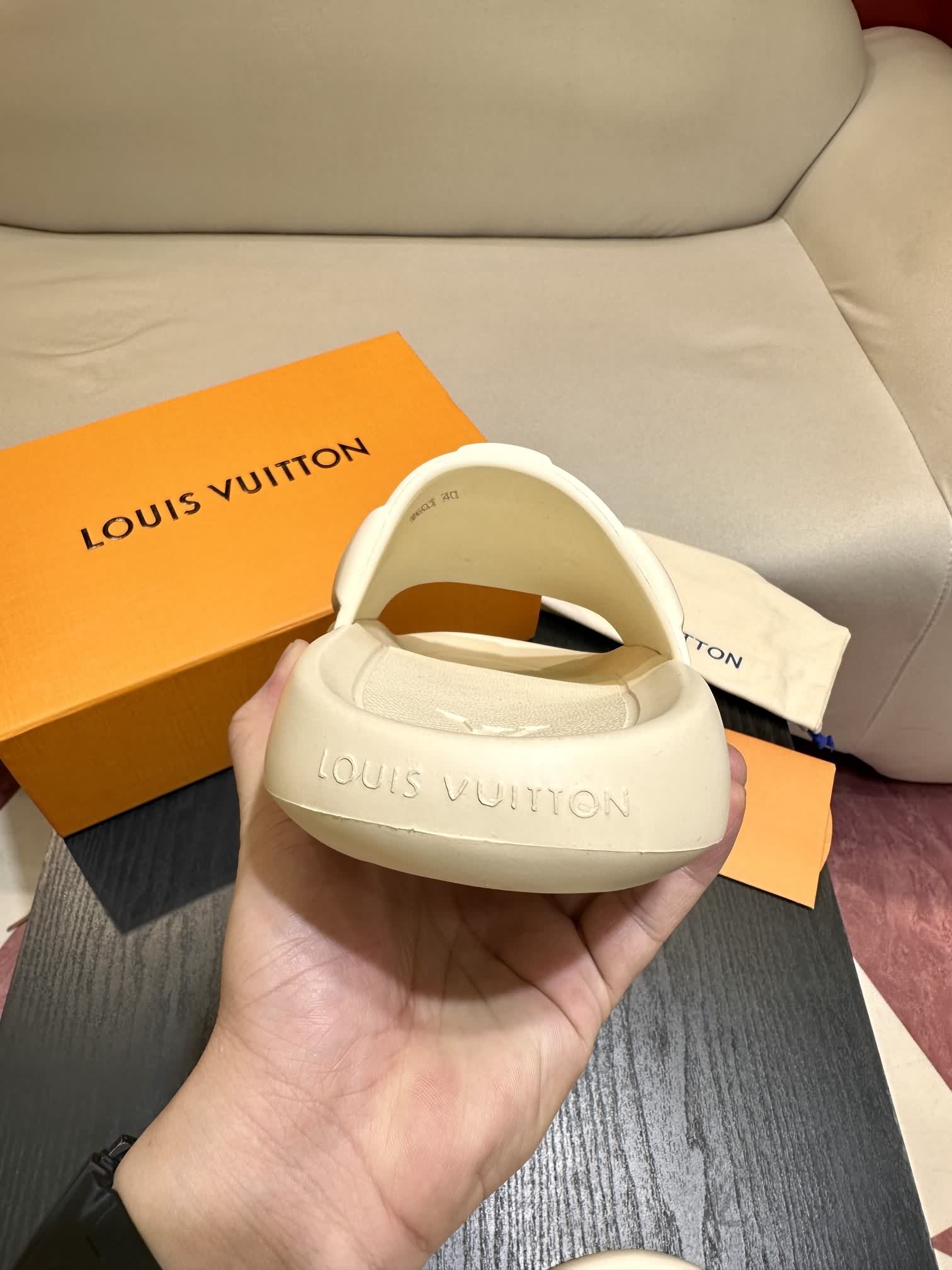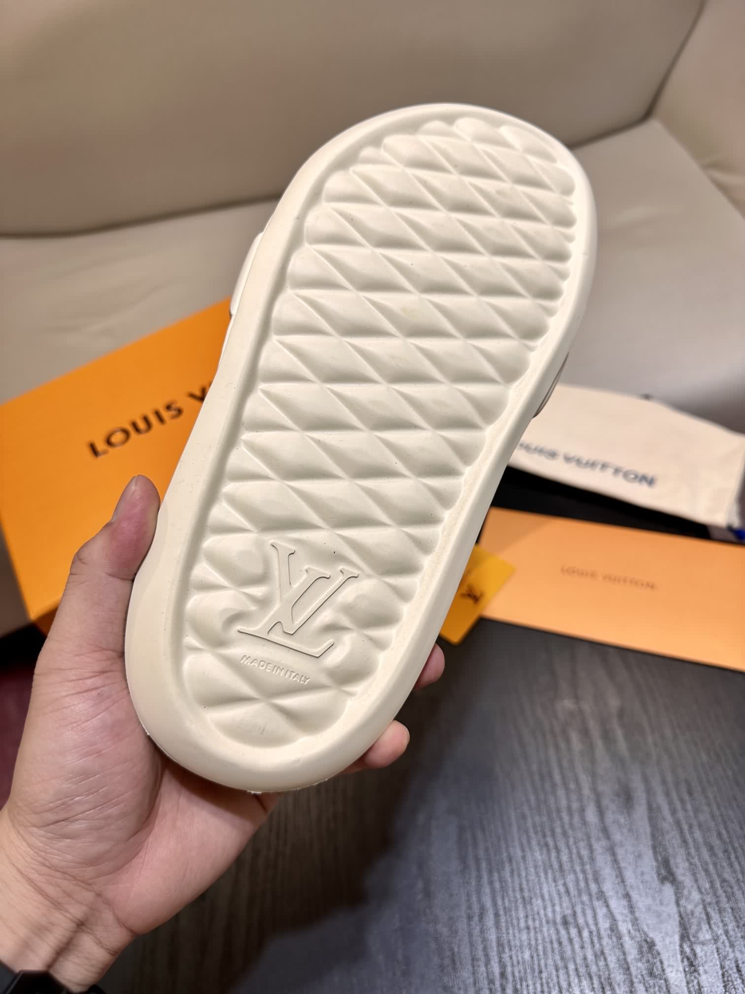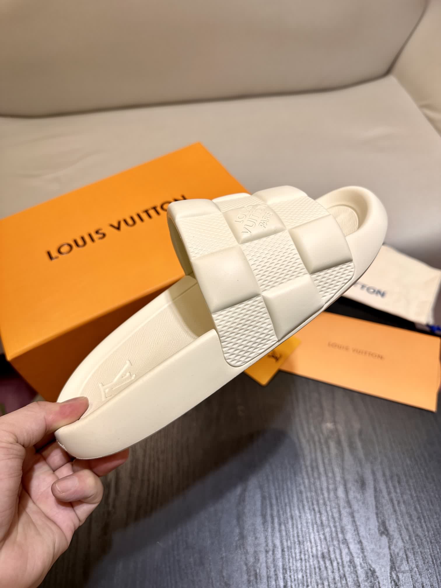 LV情侶款本款 Waterfront 涼拖取材 Maxi Damier 橡膠,創意放大路易威登的經典 Damier 圖案。防水性能適宜池畔穿著,韌性鞋墊和輕盈橡膠外底升級舒適體驗。 Size 35-45