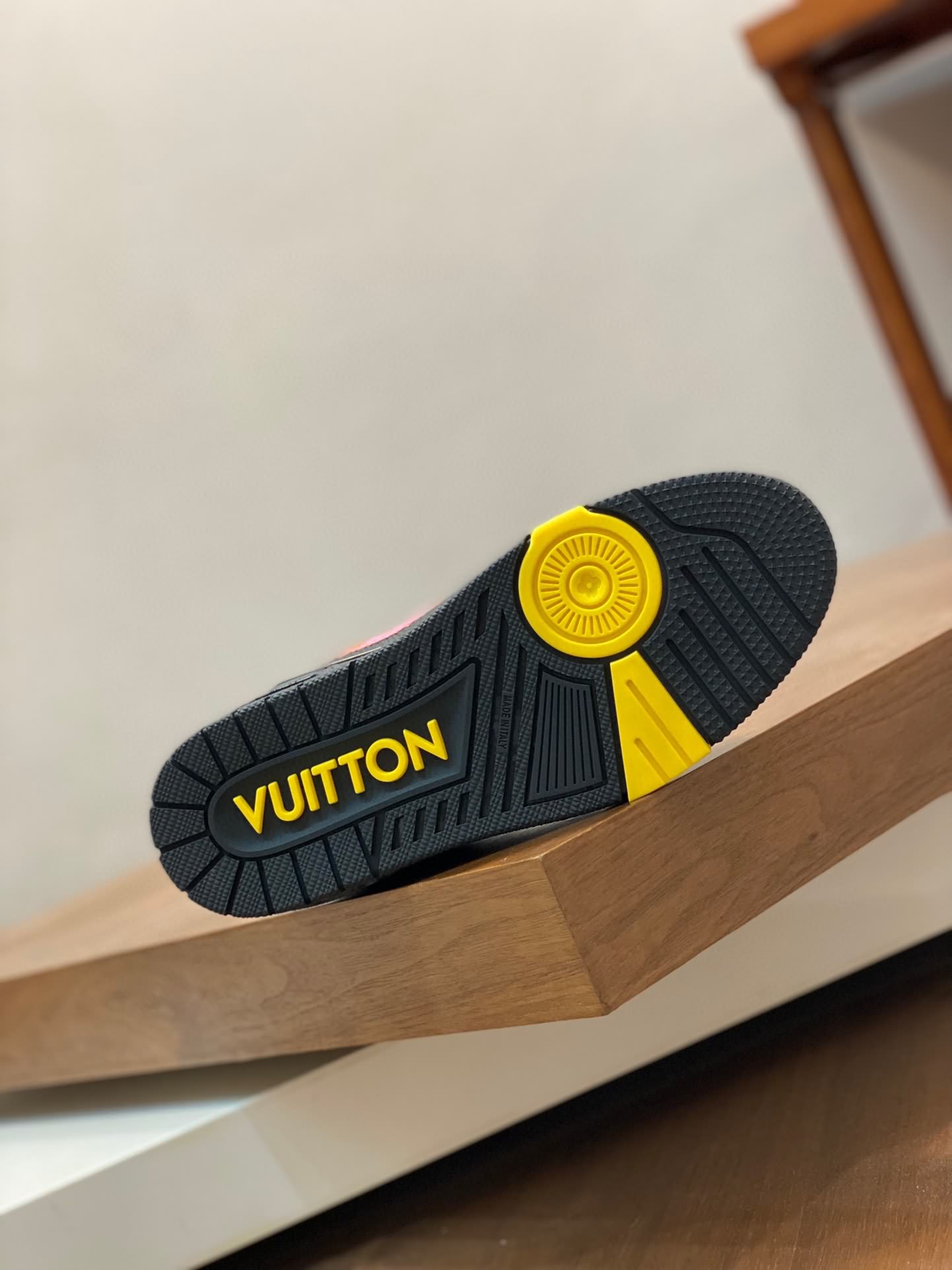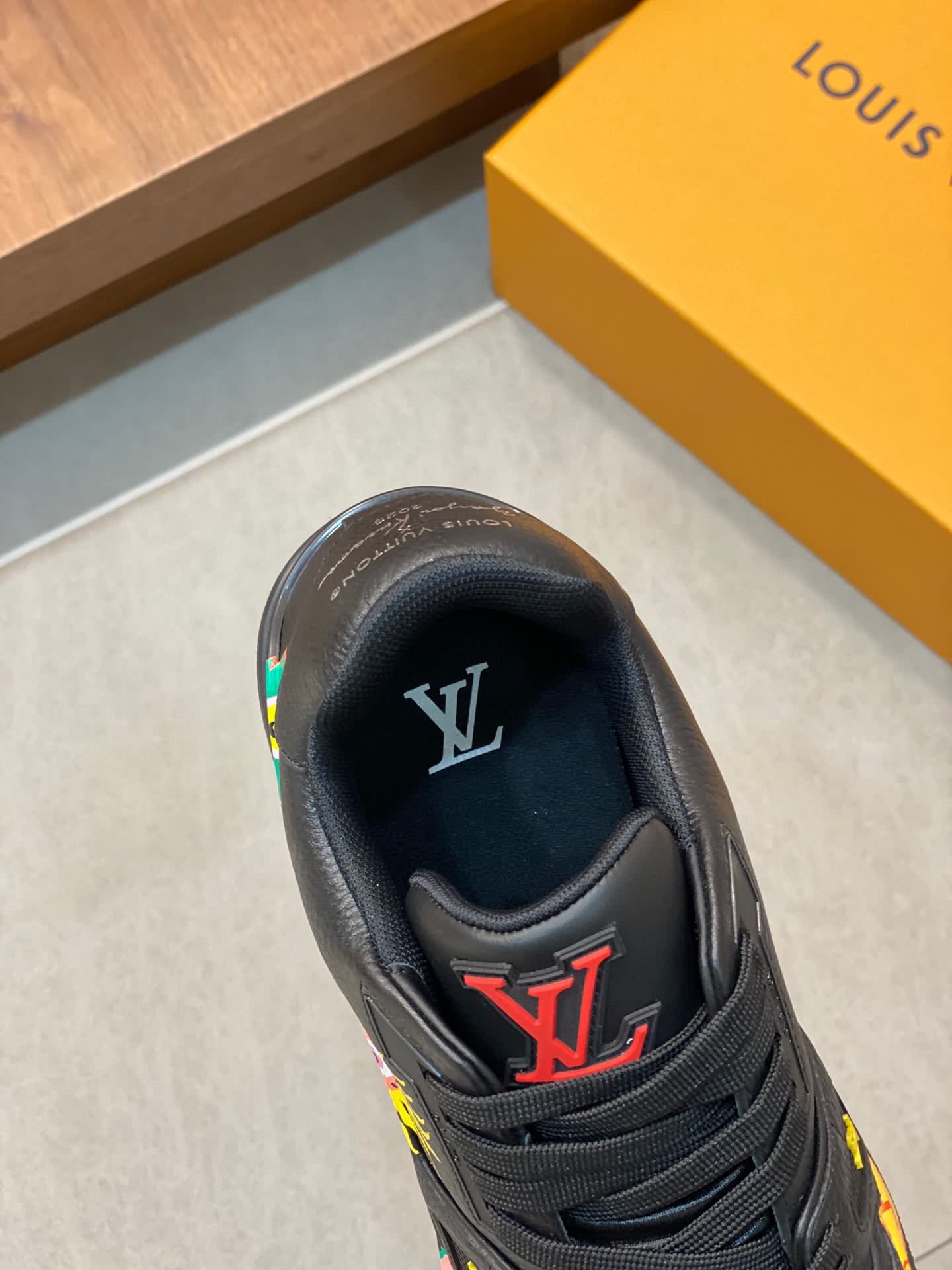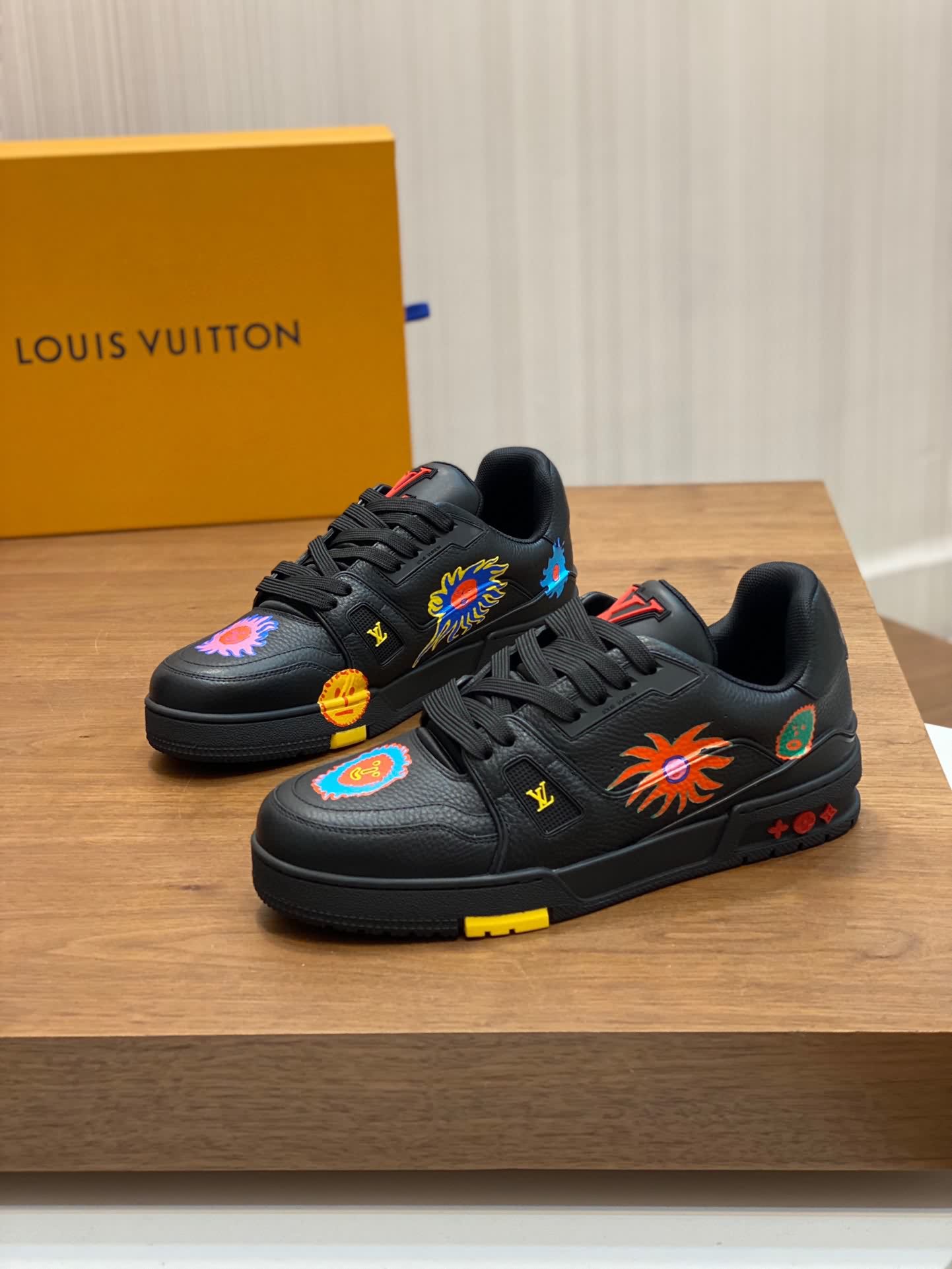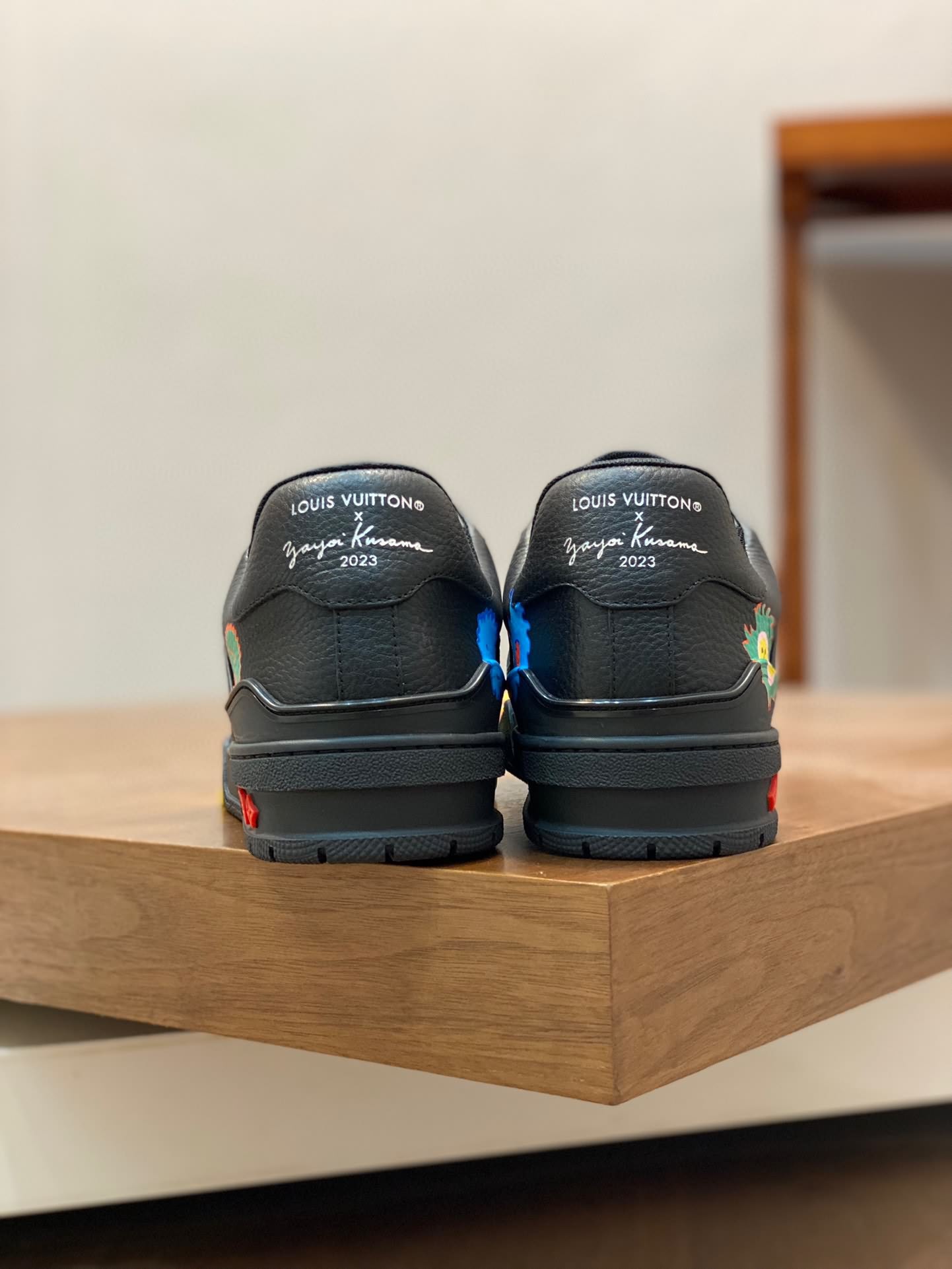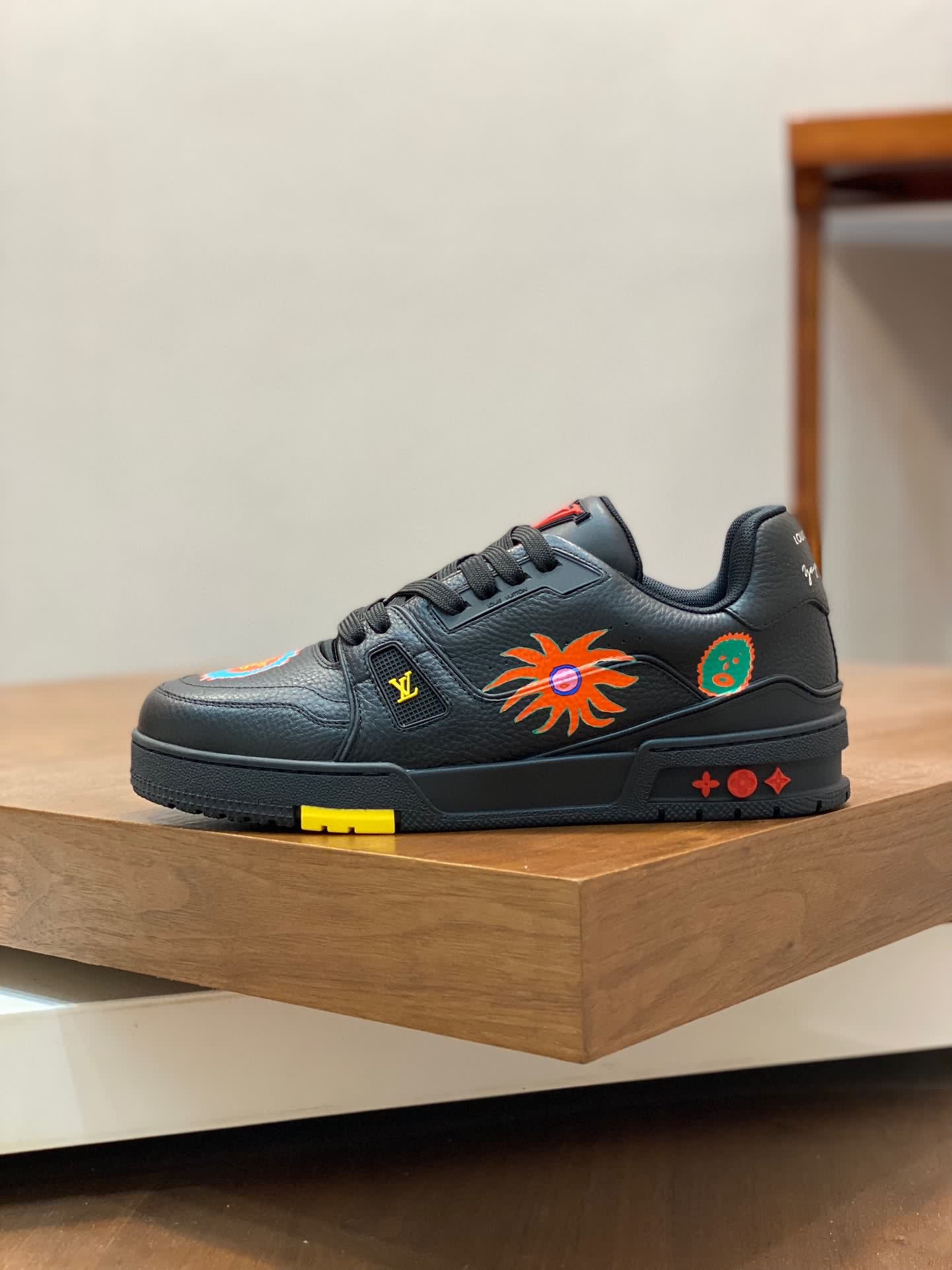 LV奢品Trainer情侶款休閒運動鞋 ,路易威登 x 草間彌生合作系列推出限定款 L*x YK LV Trainer 運動鞋,於粒面牛皮革表面描繪絢爛面孔印花,靈感源自藝術家自 2009 年起創作的《My Eternal Soul》系列繪畫。鞋後標注路易威登 x 草間彌生 2023 合作系列標識。科技橡膠外底配有創新凝膠內墊,舒適感更為出眾,經典的籃球鞋款,回頭率杠杠的,搭配輕易,上腳透氣舒適! Size:35-45