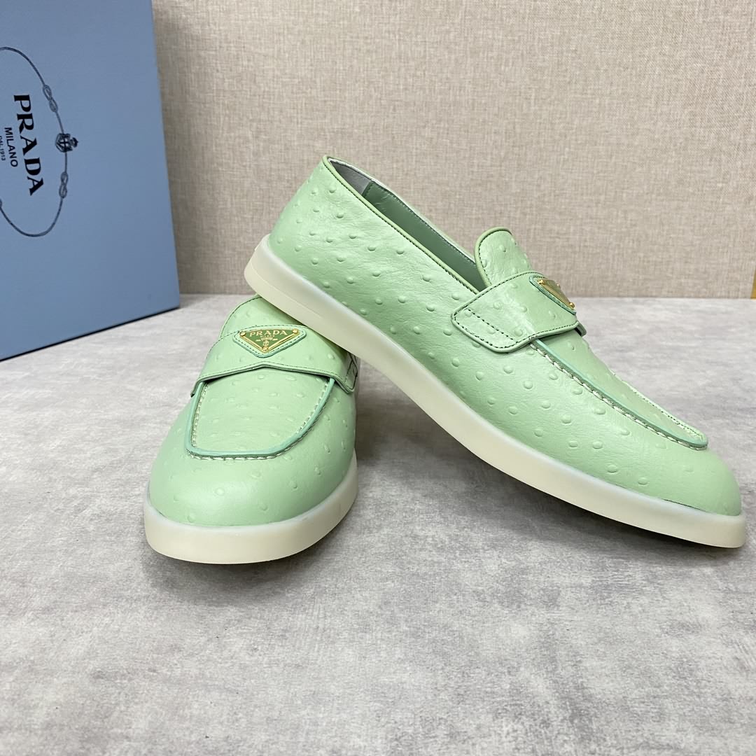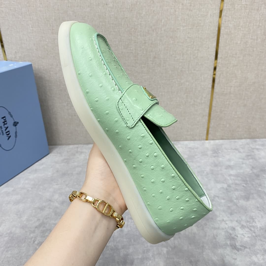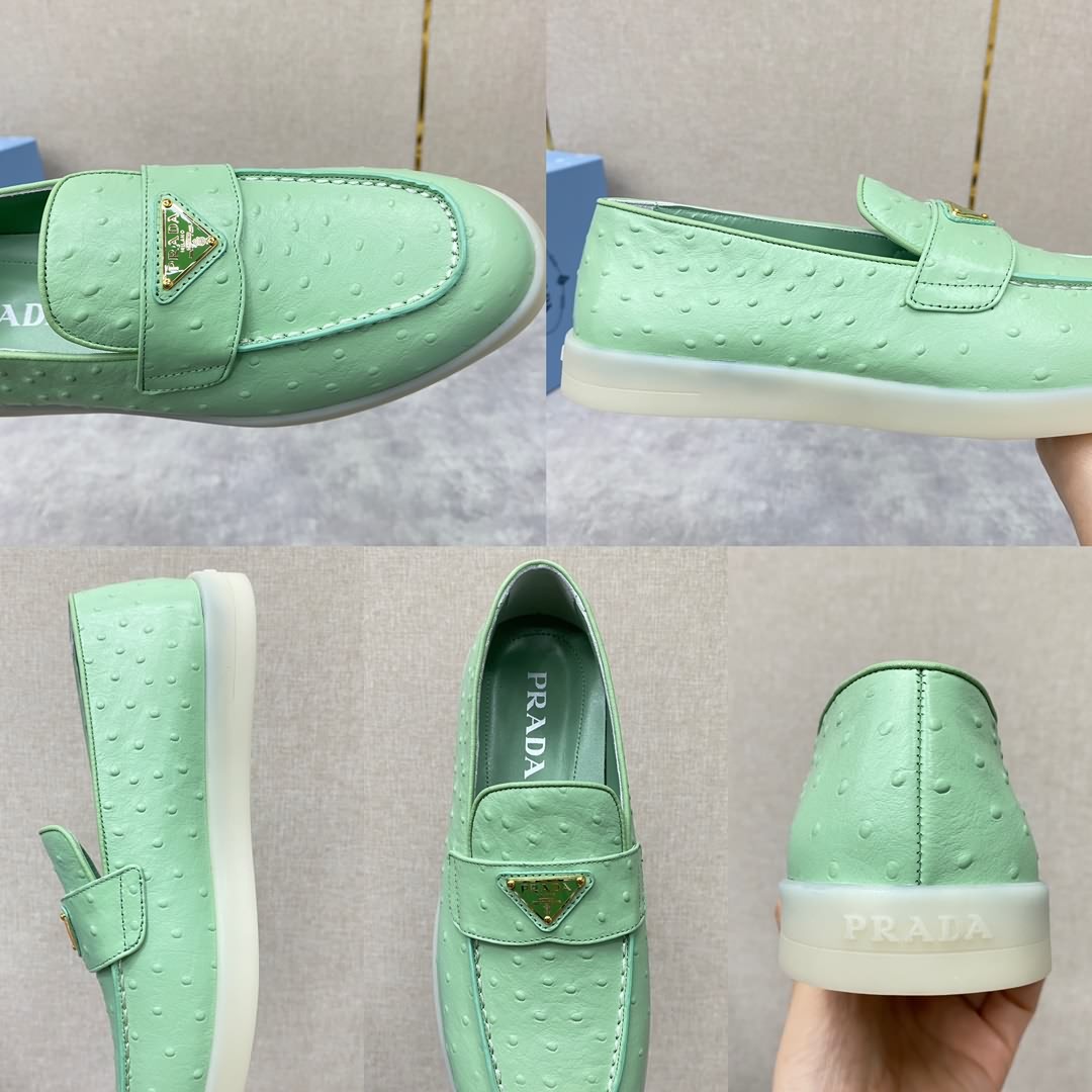 P家 情侶款新品上架 PRAD* 普拉-達 牛皮樂福鞋 官方售價RMB ¥8,200 這款樂福鞋採用進口鴕鳥紋牛皮配以水染牛皮皮革襯裏, 塑就摩登廓形。正面橫帶飾塗琺瑯金屬三角形徽標裝飾引人注目。 鞋頭蓋配箍縮接縫。鞋口處飾同色系牛皮滾邊加持 雙層牛皮墊腳細節 拆卸原版牛皮沖孔墊 原版開模輕質半透明橡膠大底 一腳蹬穿著 輕便舒適款 夏日清爽穿搭的不二之選 標準專櫃碼數:35~44# 女碼:35~39# (34.40.41.42定做) 男碼:39~44# (38.45.46定做)