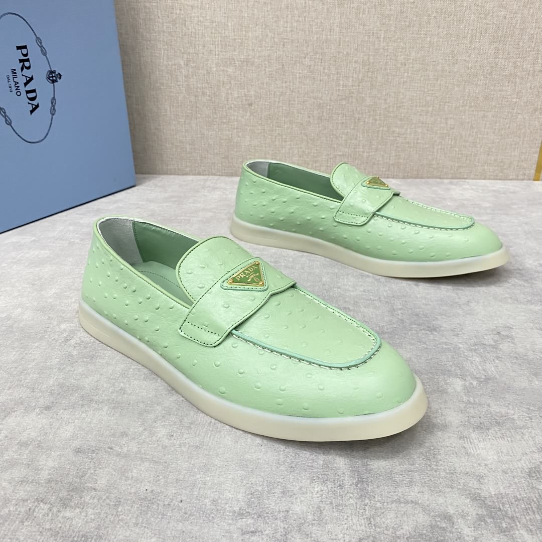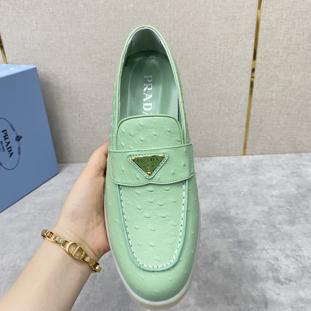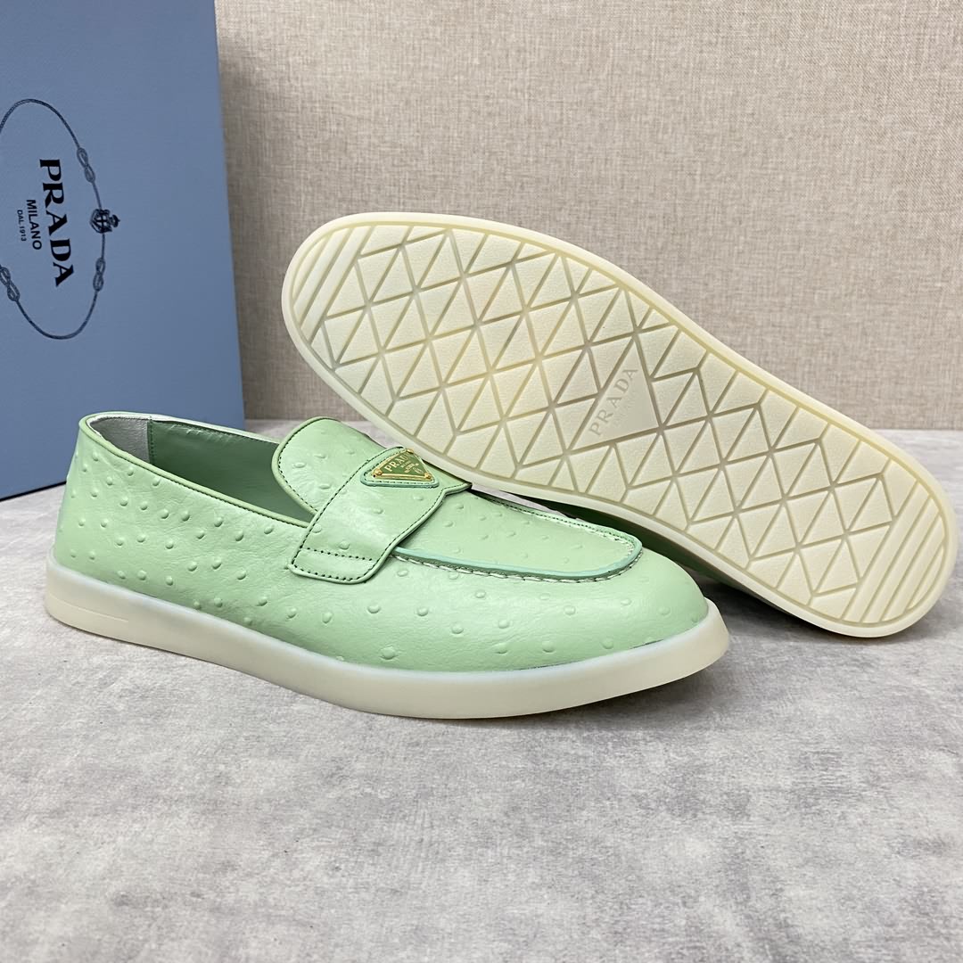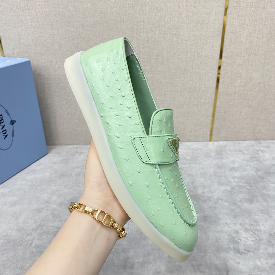 P家 情侶款新品上架 PRAD* 普拉-達 牛皮樂福鞋 官方售價RMB ¥8,200 這款樂福鞋採用進口鴕鳥紋牛皮配以水染牛皮皮革襯裏, 塑就摩登廓形。正面橫帶飾塗琺瑯金屬三角形徽標裝飾引人注目。 鞋頭蓋配箍縮接縫。鞋口處飾同色系牛皮滾邊加持 雙層牛皮墊腳細節 拆卸原版牛皮沖孔墊 原版開模輕質半透明橡膠大底 一腳蹬穿著 輕便舒適款 夏日清爽穿搭的不二之選 標準專櫃碼數:35~44# 女碼:35~39# (34.40.41.42定做) 男碼:39~44# (38.45.46定做)