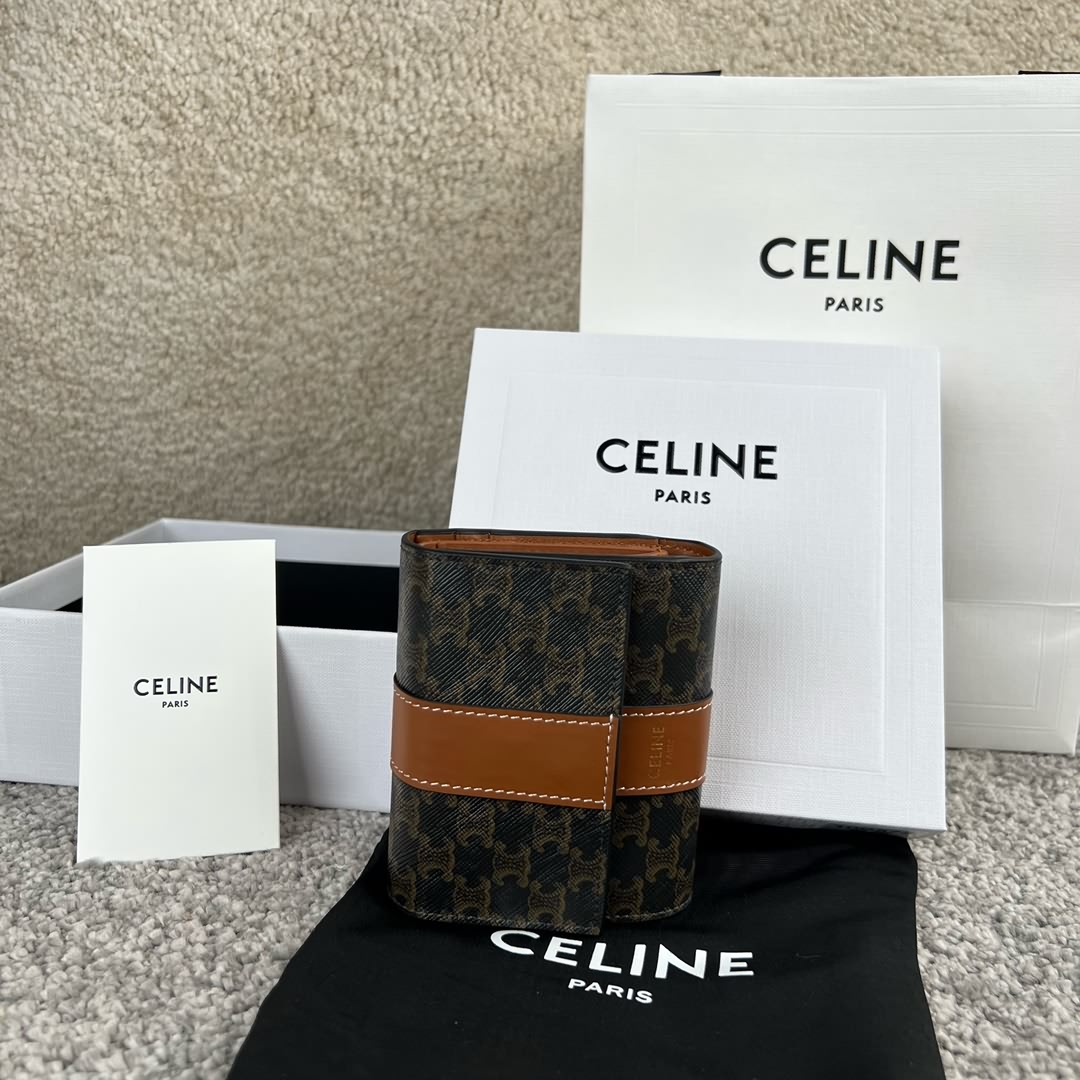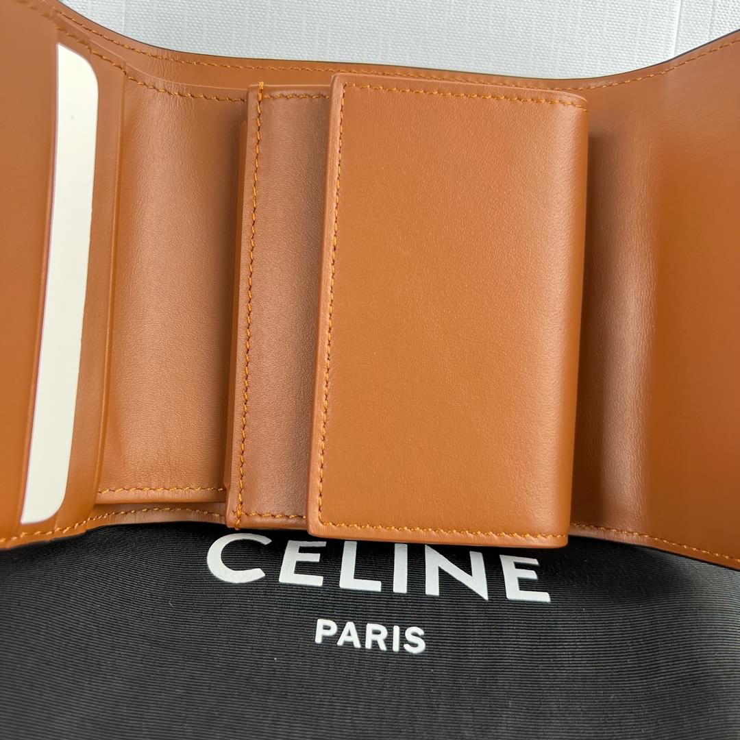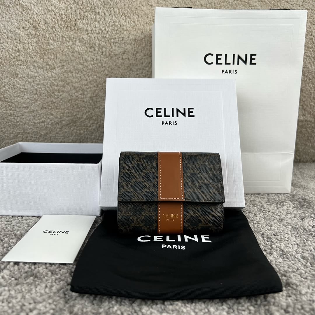 小號標誌印花羊皮革三折錢包,尺寸10.5x8.5 cm pvc革/ 羊皮革,襯裏牛皮革,按扣翻蓋開合影,5 個信用卡槽,一個大號紙幣袋,兩個扁平口袋,一個按扣折疊零錢袋,編碼10D572