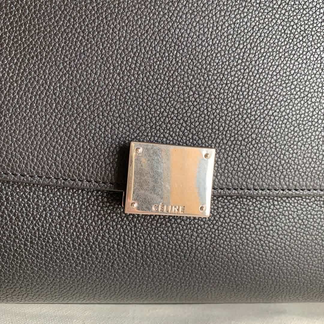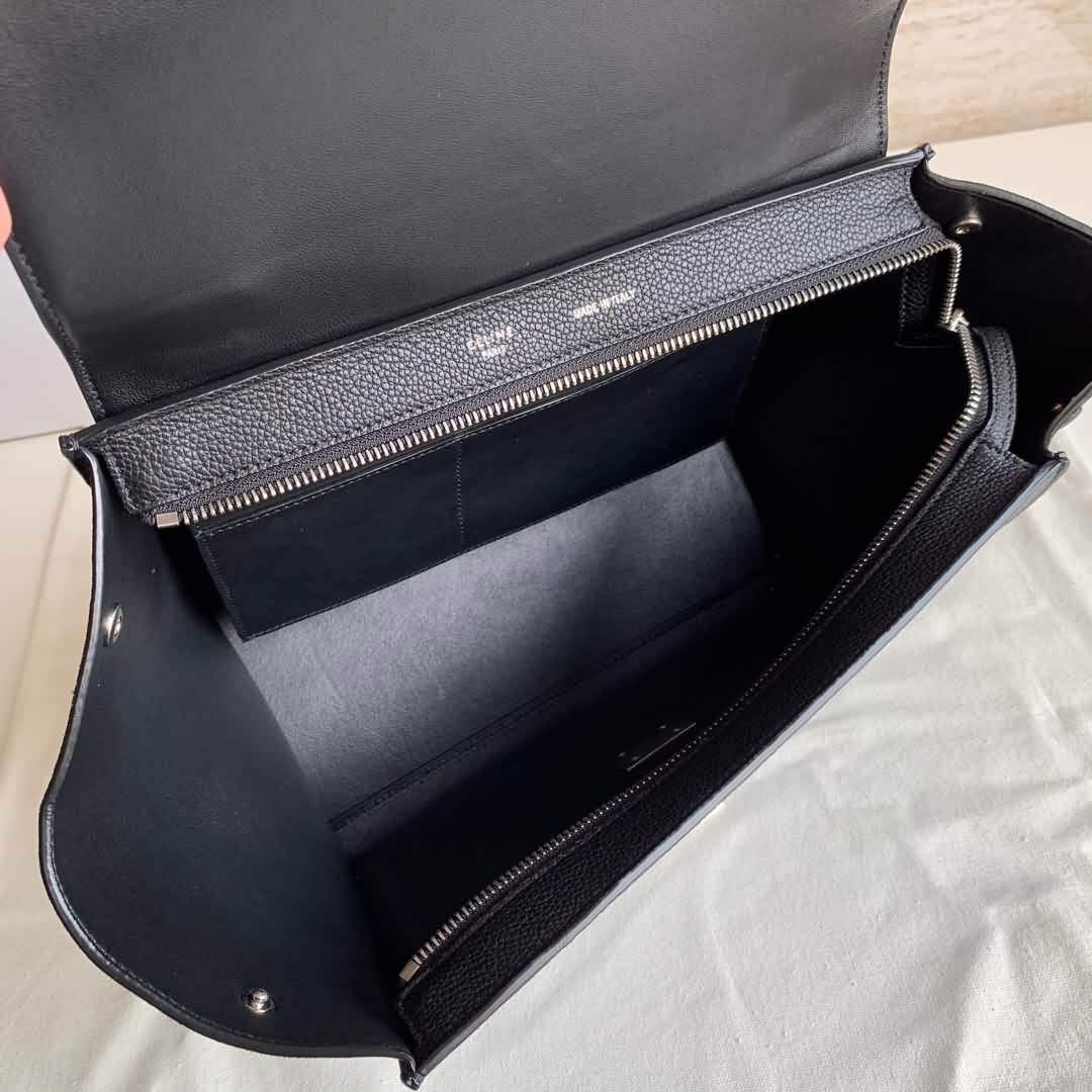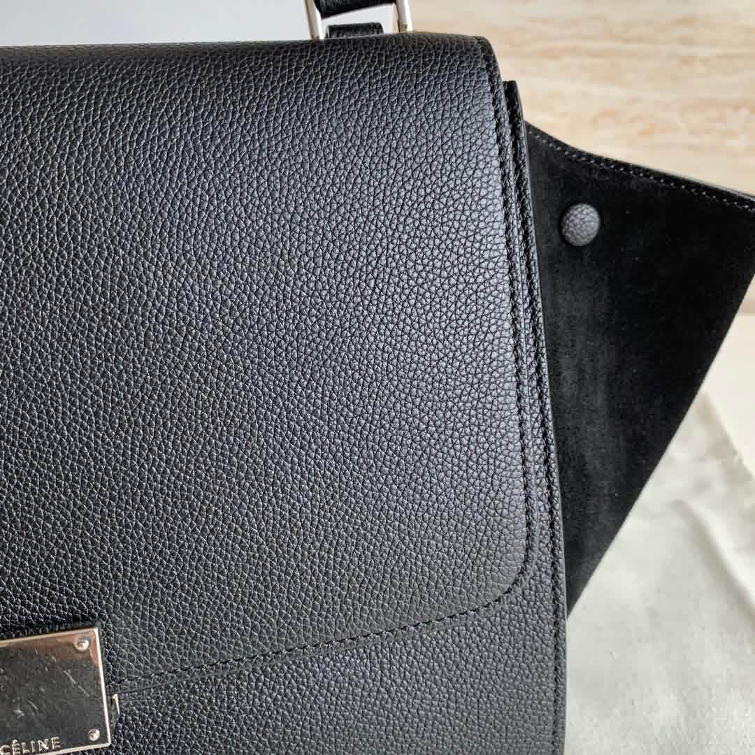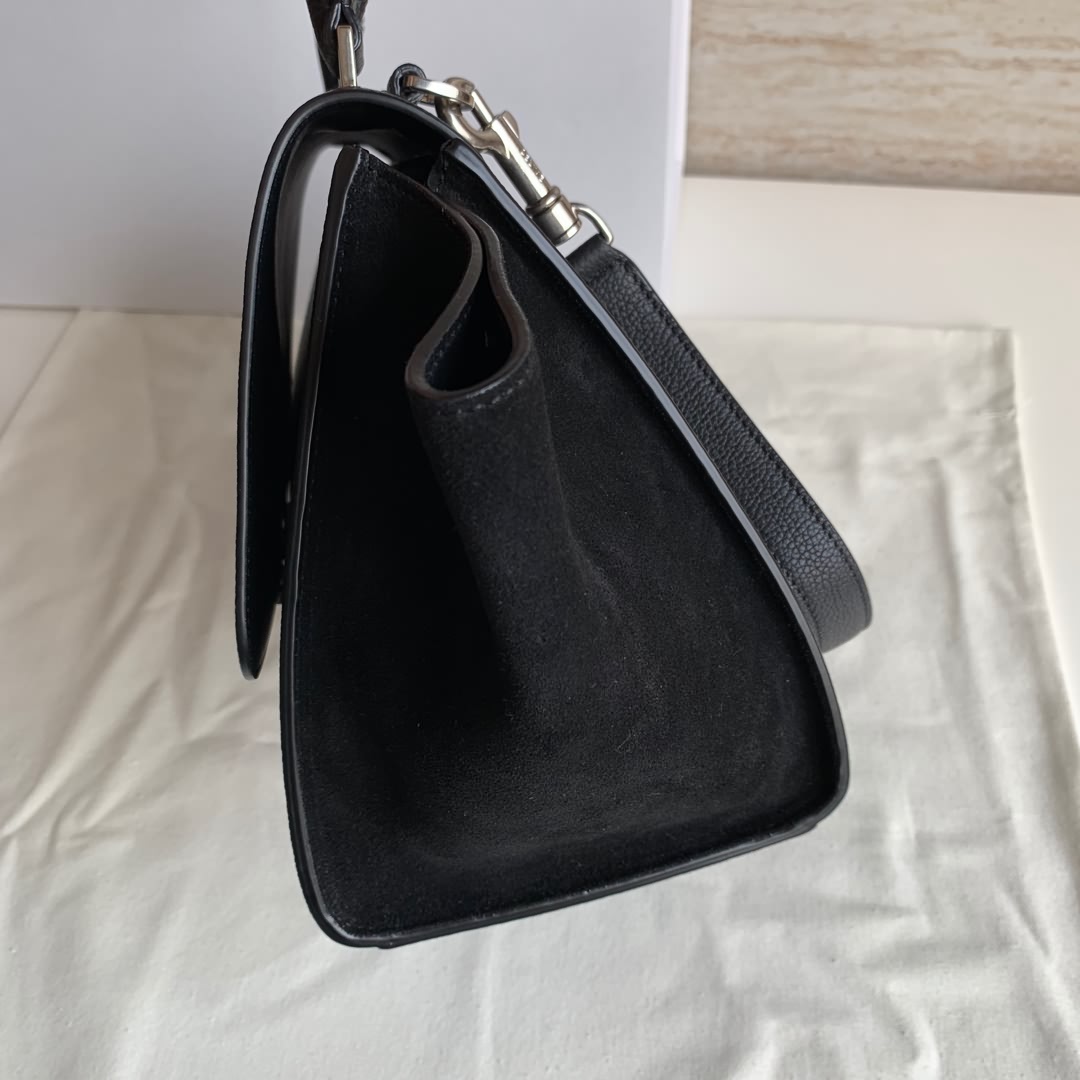 秋千包,黑色荔枝紋,海外原單TRAPEZE拼色銀扣,可拆卸肩帶,可肩背。翻蓋下為拉鏈閉合。後幅配有外部拉鏈袋,內設2個內袋。尺寸26*22*13cm