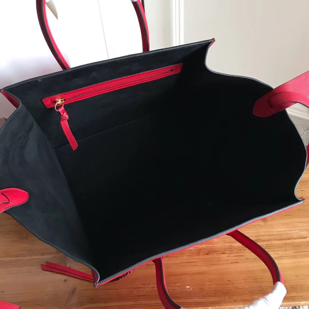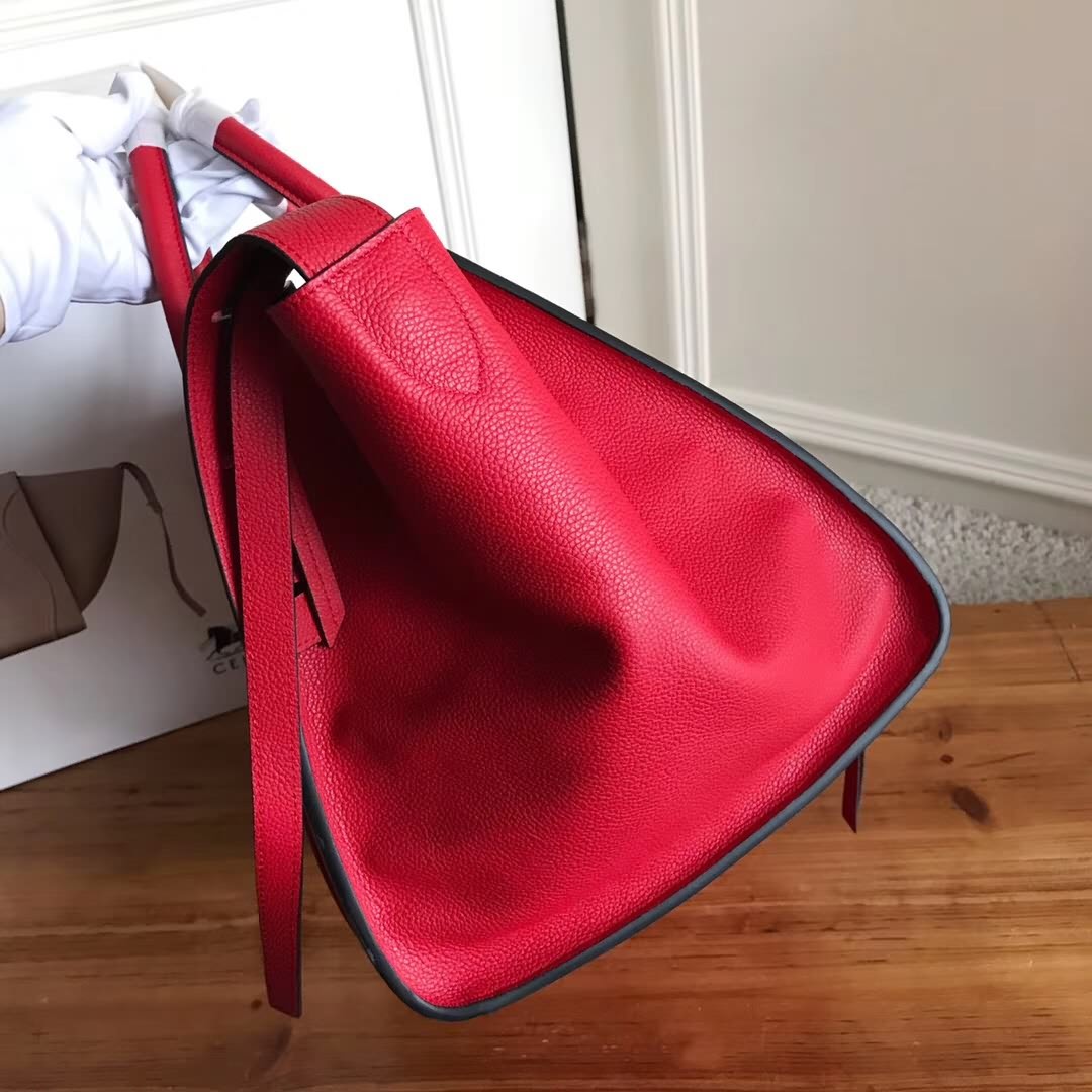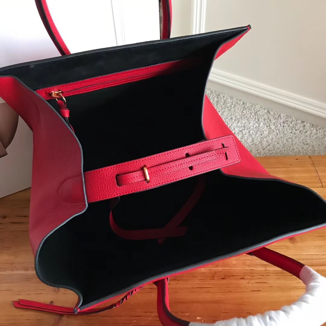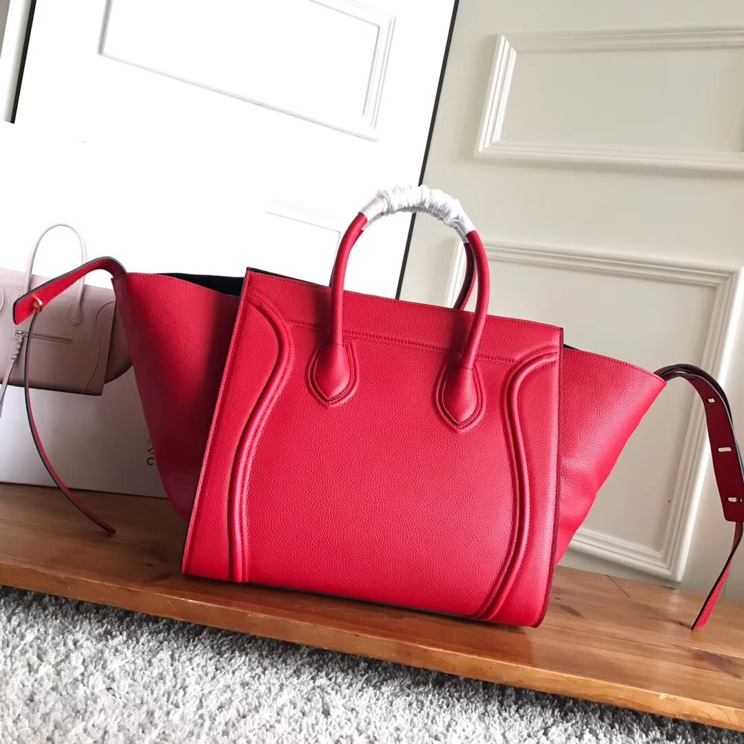 Celin*Phantom大紅荔枝紋幻影蝙蝠包 側面皮繩上的鎖扣可用於閉合手袋。手袋正面設小號拉鏈口袋。內設拉鏈口袋。底部柳釘用以保護底座。金色金屬配件。尺寸30*28*24cm