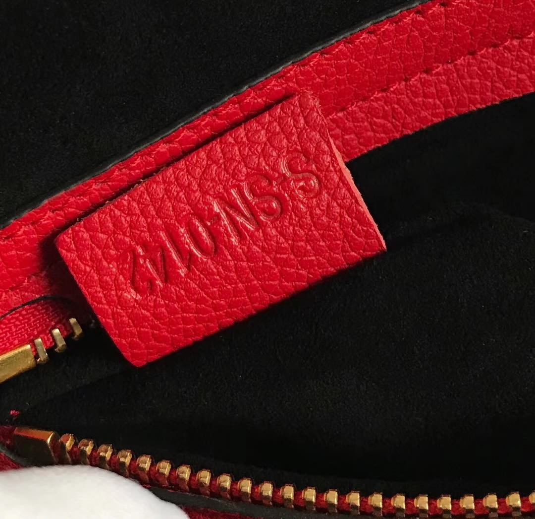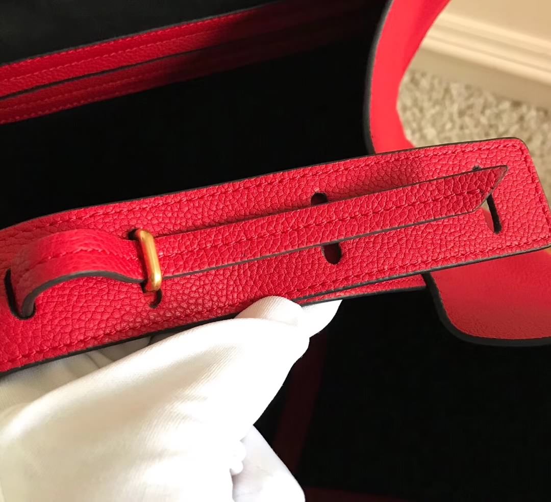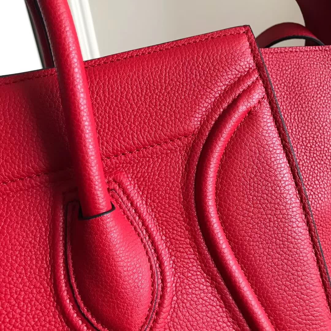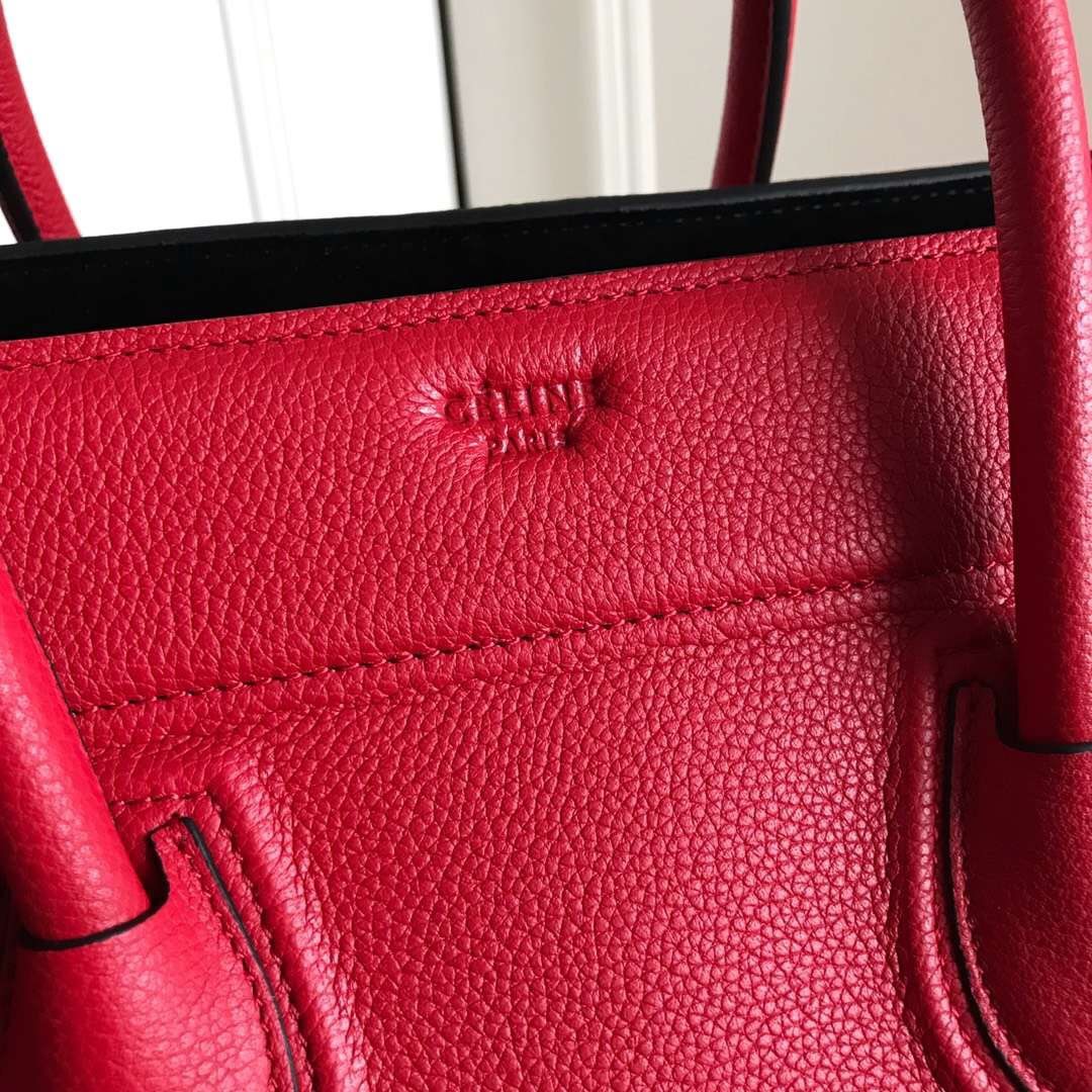 Celin*Phantom大紅荔枝紋幻影蝙蝠包 側面皮繩上的鎖扣可用於閉合手袋。手袋正面設小號拉鏈口袋。內設拉鏈口袋。底部柳釘用以保護底座。金色金屬配件。尺寸30*28*24cm