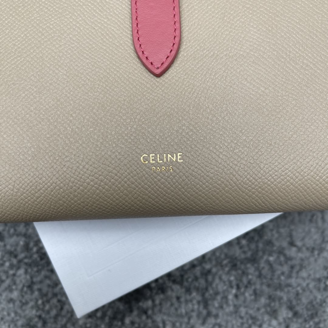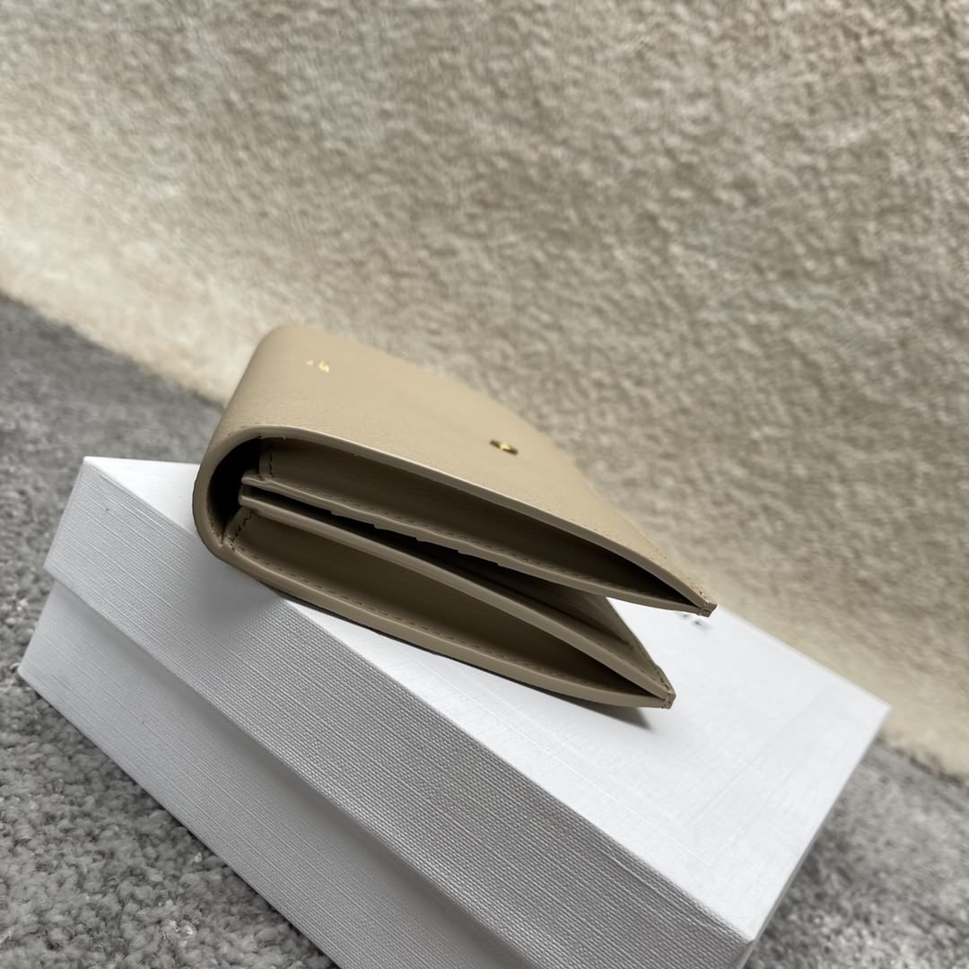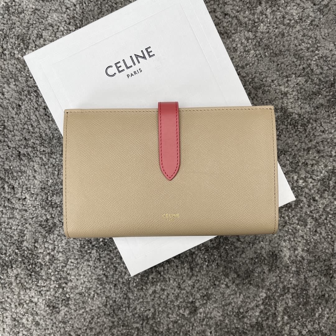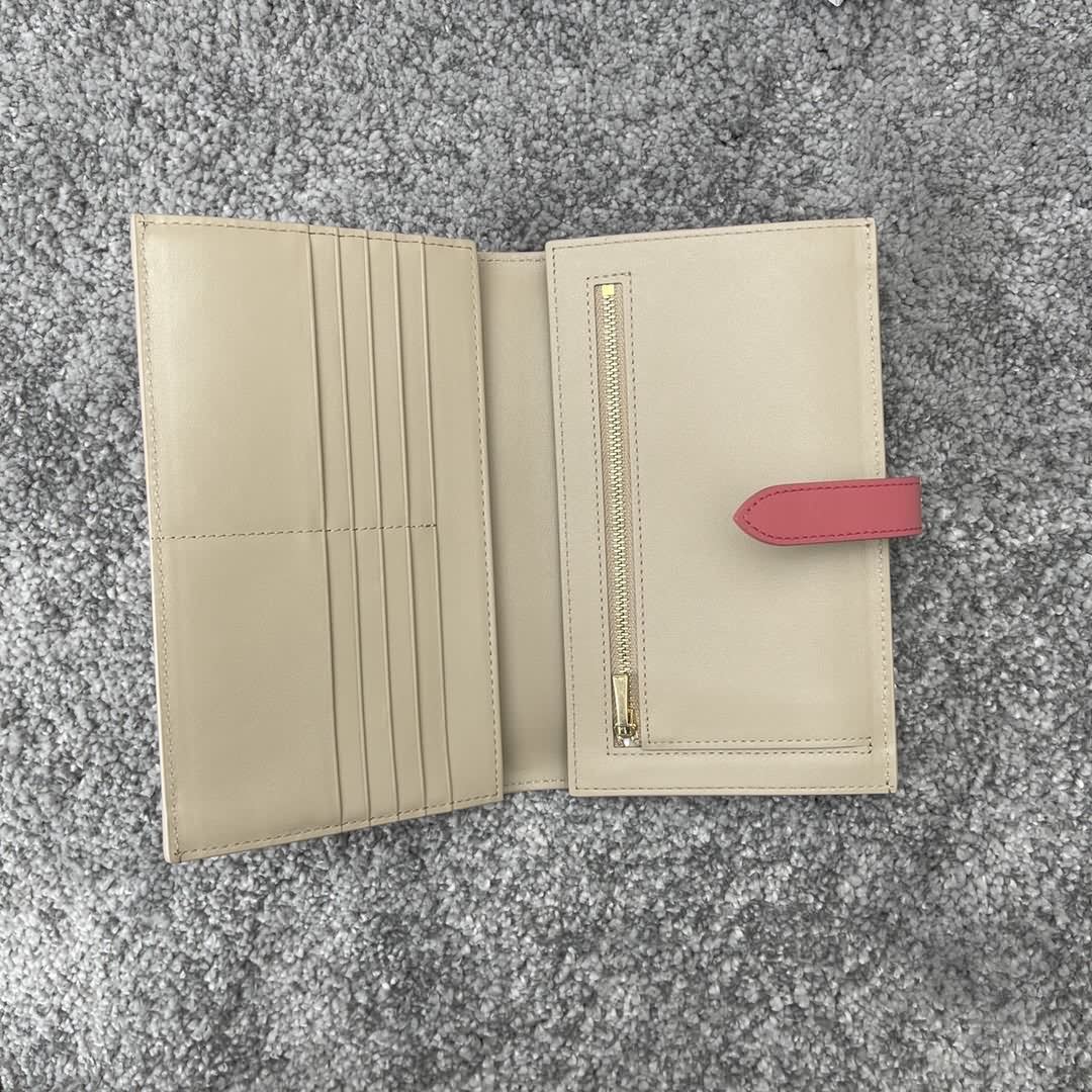 粒面小牛皮錢包,附按扣開合的扣帶及角撐隔層。