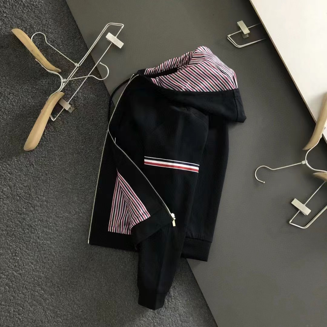 最新最頂級紅藍條紋內裏融合織帶拼色金屬拉鏈連帽休閑套裝,最頂級的品質專櫃在售,頂級製作工藝進口面料,專櫃款獨特設計,采用進口高端訂製進口絲線手感一流!官網在售