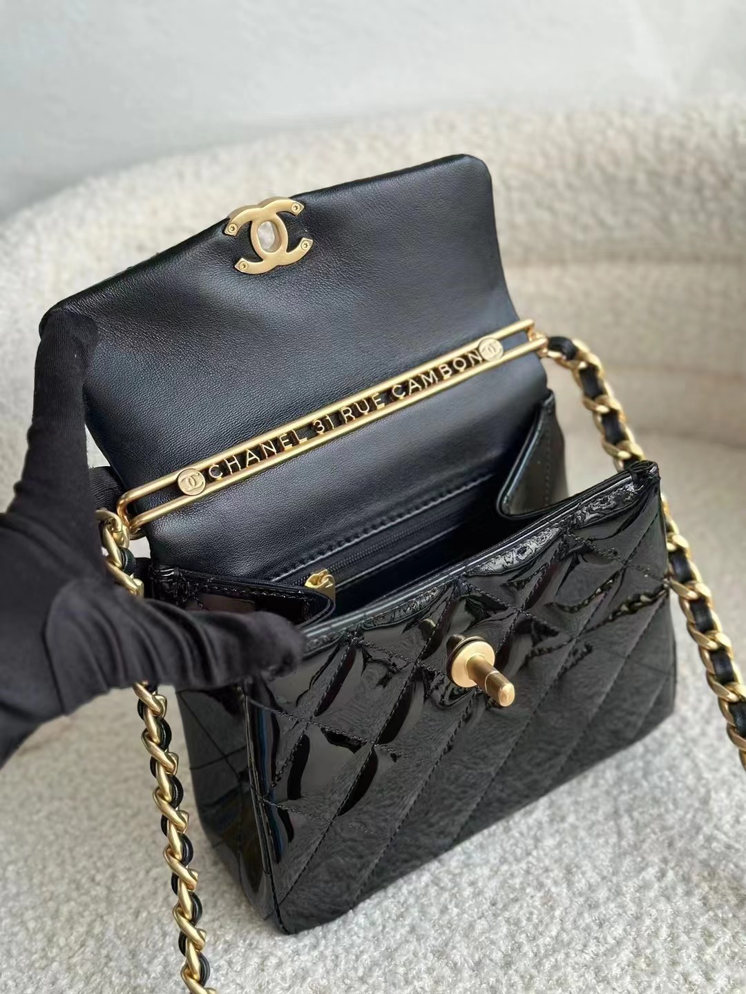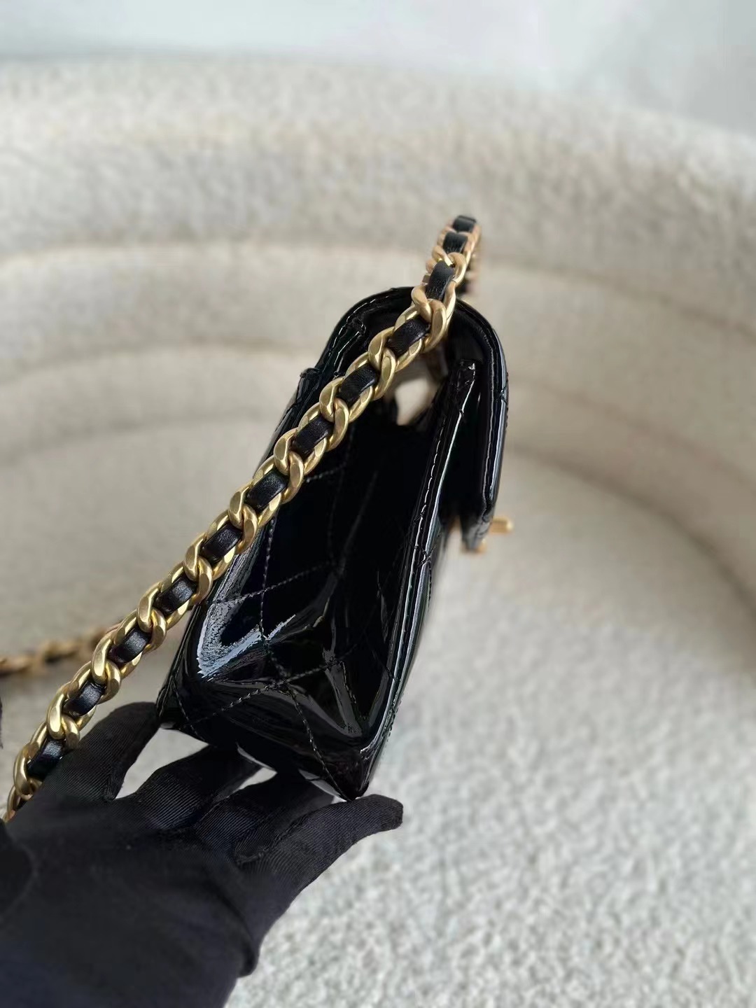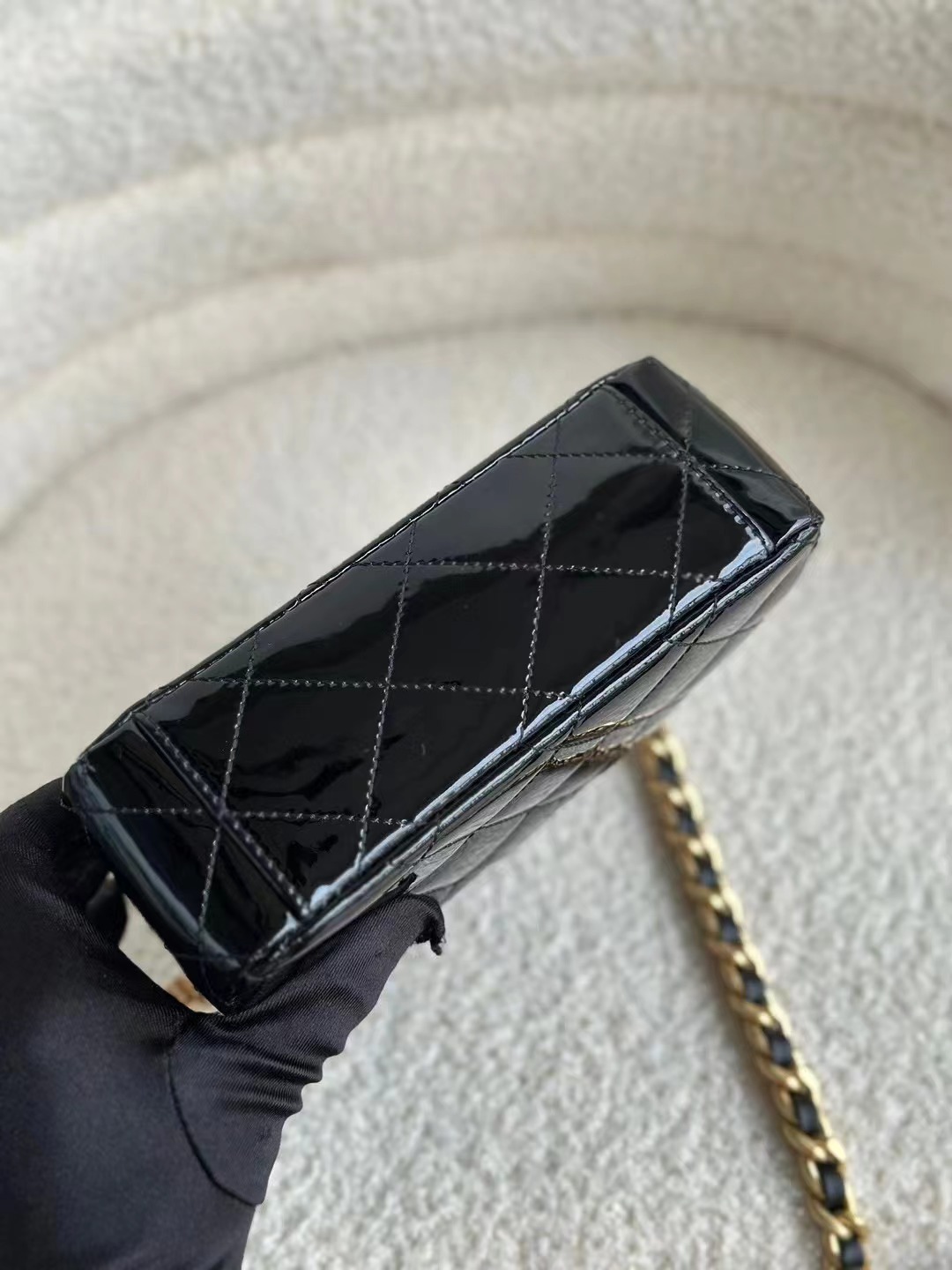 小巧的包身搭配漆皮黑色包面,再點綴上金色五金超顯高級